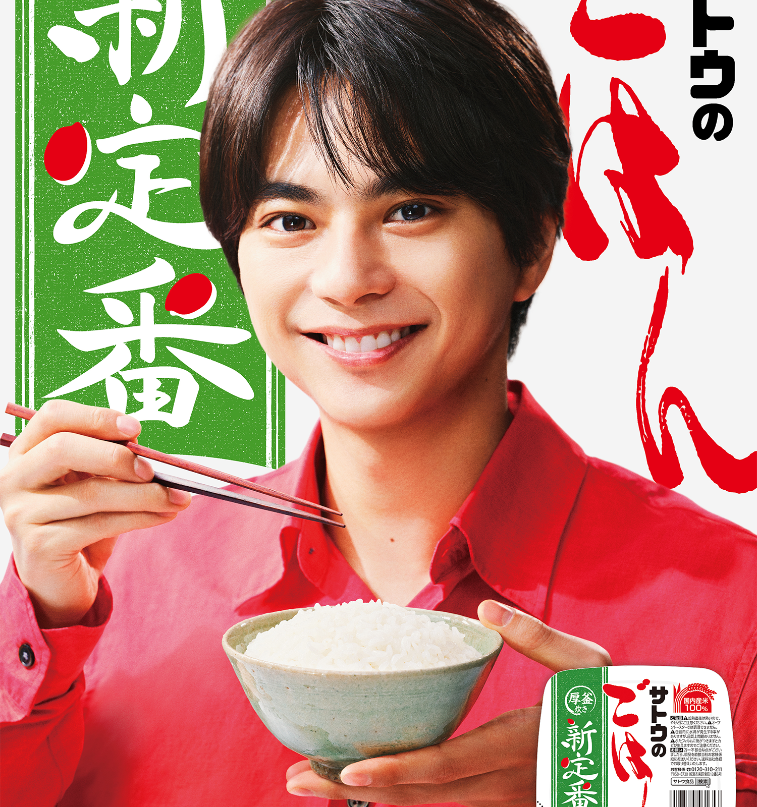全国で発売中の「サトウのごはん」シリーズの新商品「新定番」のCMに佐藤勝利さんが出演する。